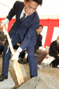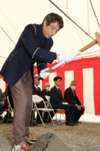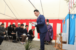 当日は、御嶽教當嶽一心教曾 群馬県教区長 森尻 晃司 様にお越しいただき、地鎮祭の神事を執り行っていただきました。